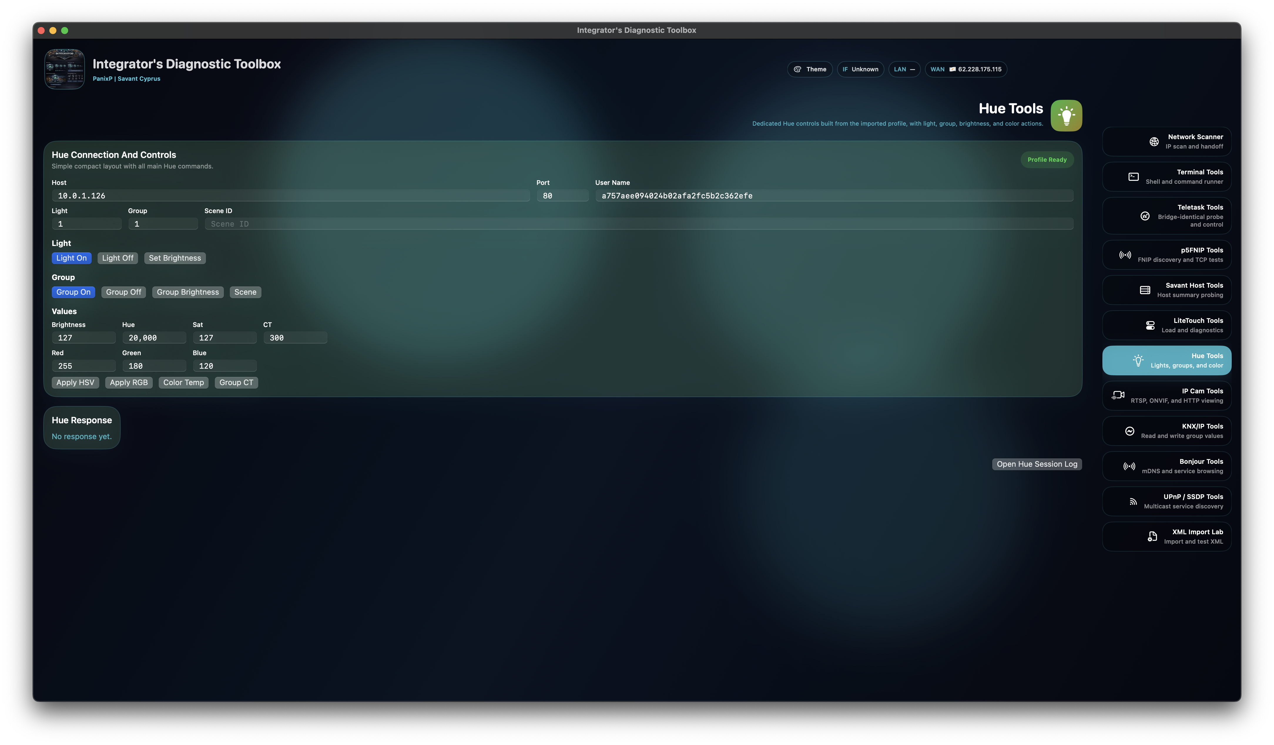 Teletask actions, FNIP TCP commands, KNX group writes, Hue adjustments, and legacy Savant LiteTouch operations allow targeted protocol validation without leaving the workspace, including test control for every p5.hu FNIP product profile, a best-in-class KNX-IP testing surface for macOS, and a uniquely capable Teletask DoIP environment for current v5 firmware estates.
