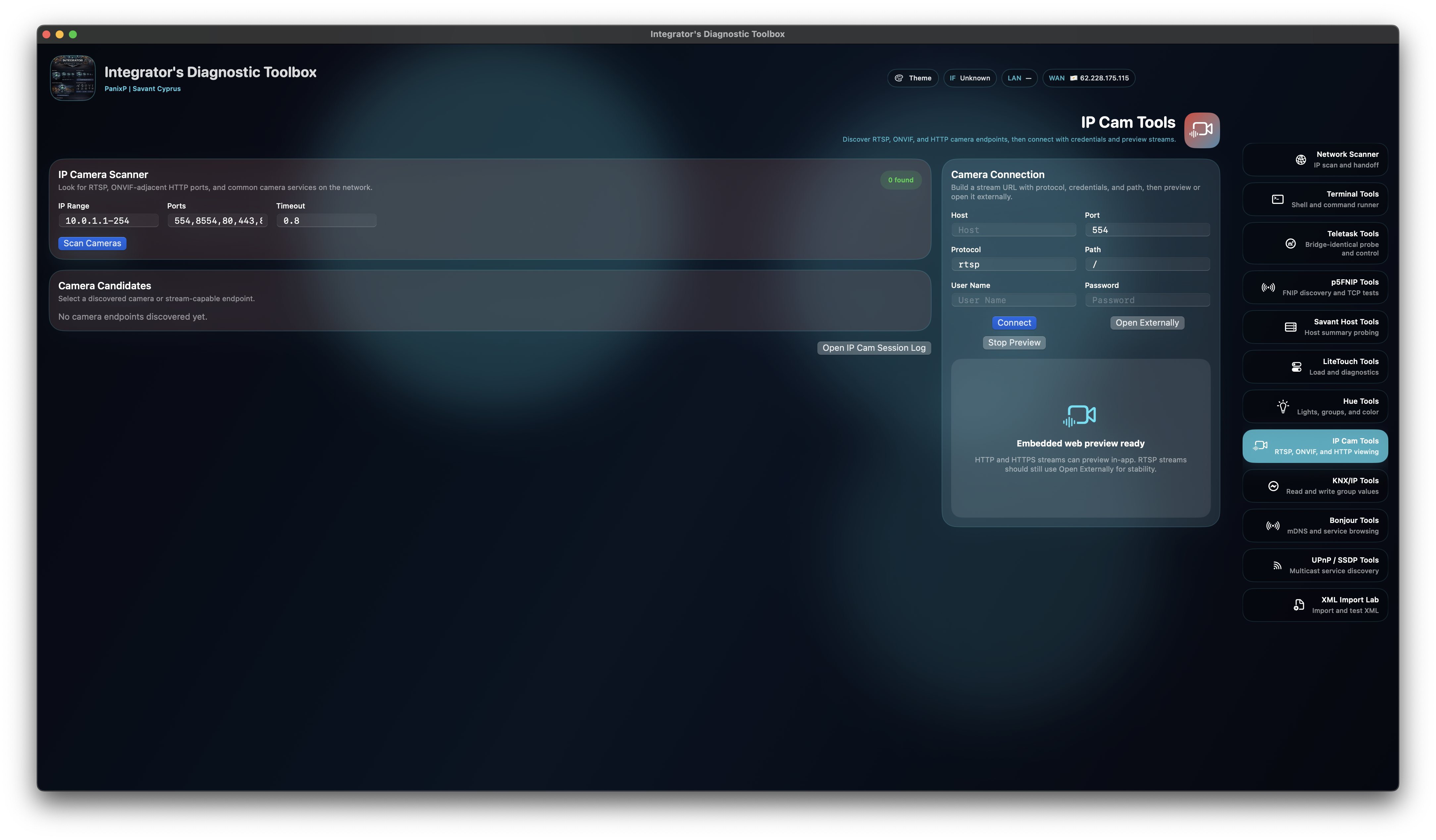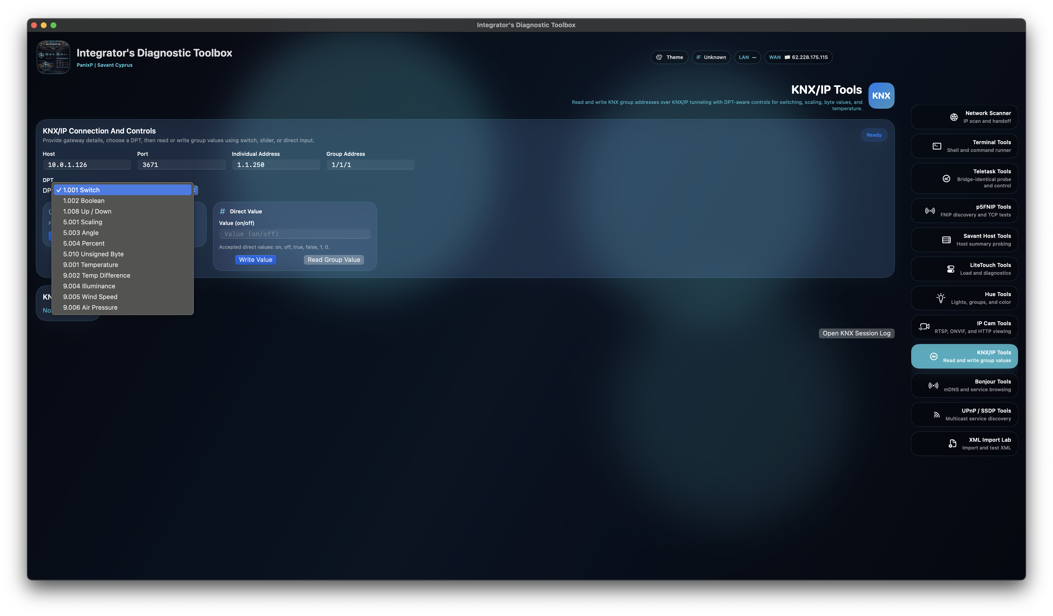 Hue control, legacy Savant LiteTouch diagnostics, RTSP/IP camera tests, Bonjour browsing, SSDP discovery, KNX/IP command tools, and terminal utilities support broader site-validation workflows around the main Savant stack, while the FNIP layer covers the full p5.hu product family and the built-in KNX tool stands out as a flagship macOS testing surface.