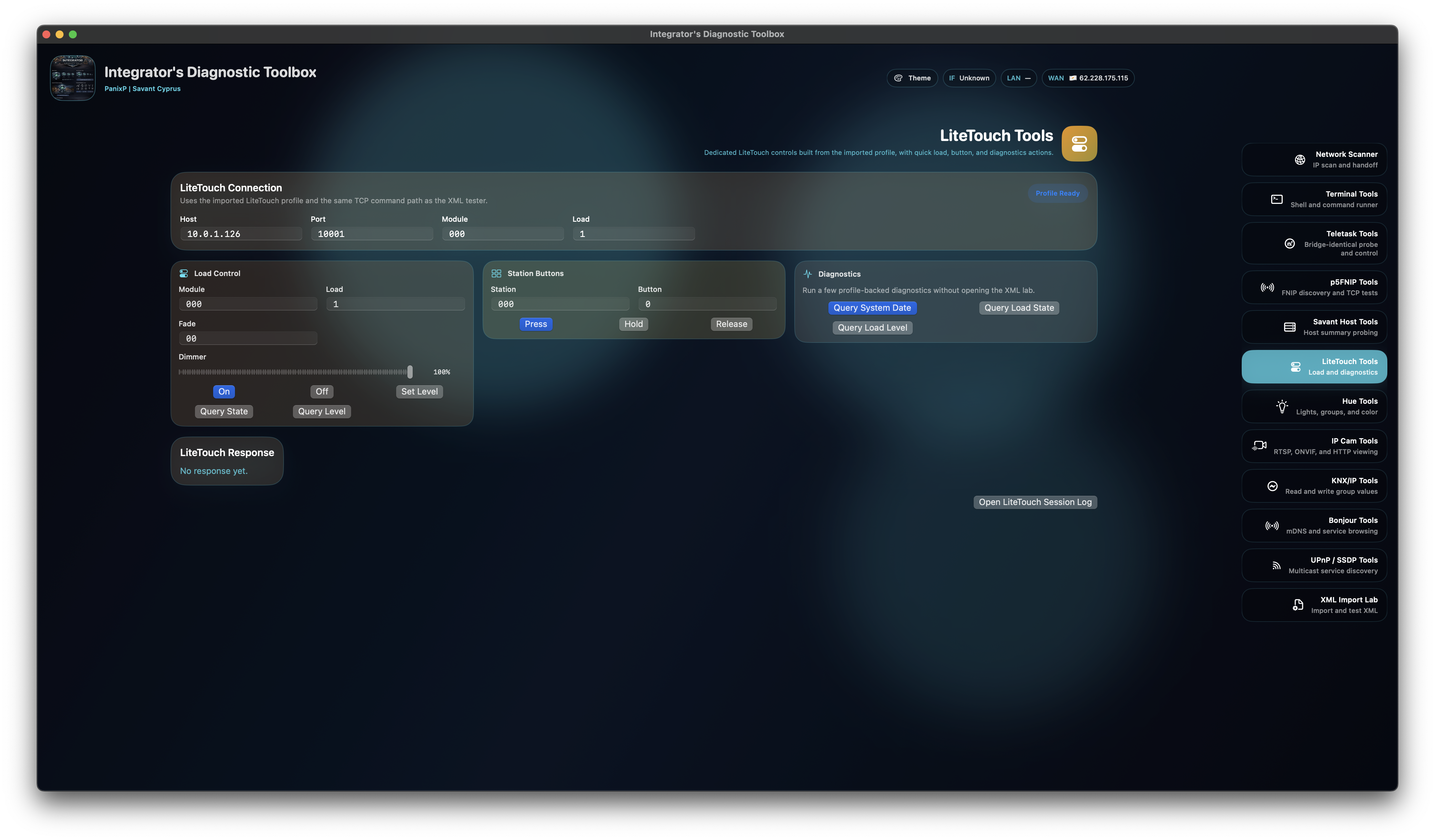 Built-in support for legacy Savant LiteTouch diagnostics, including load control, button tests, and support-oriented validation actions.