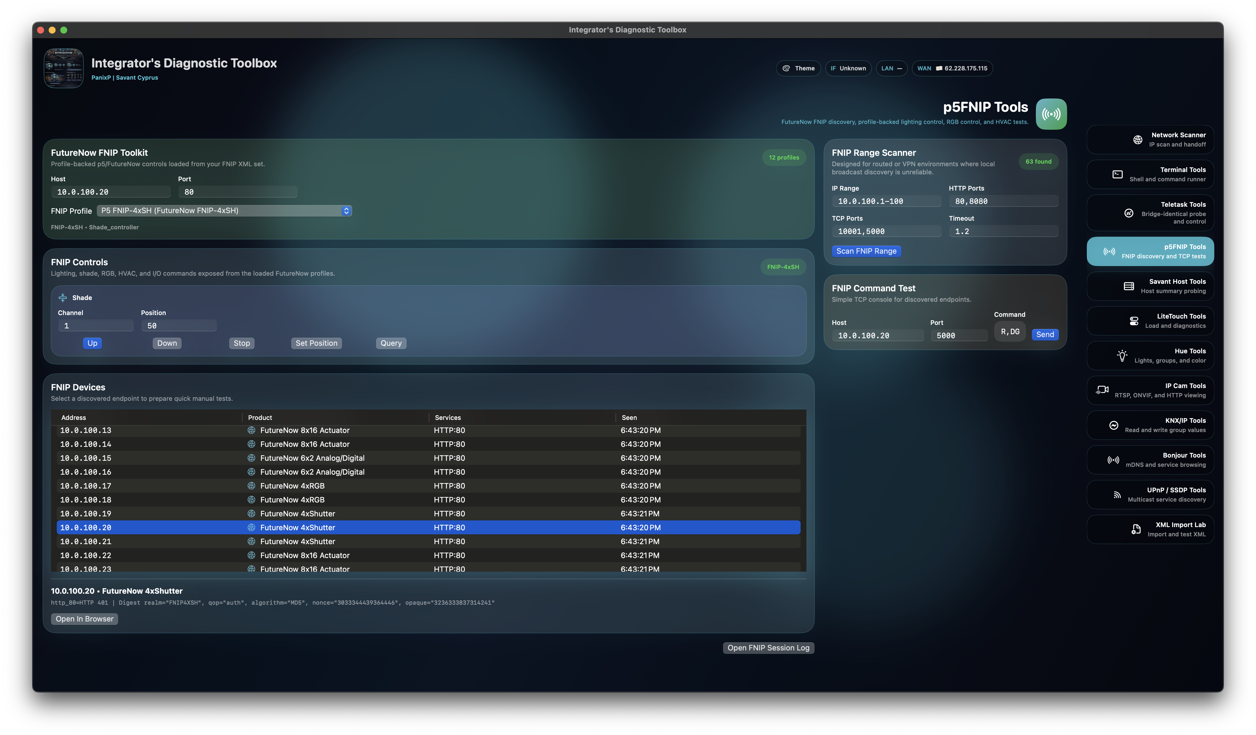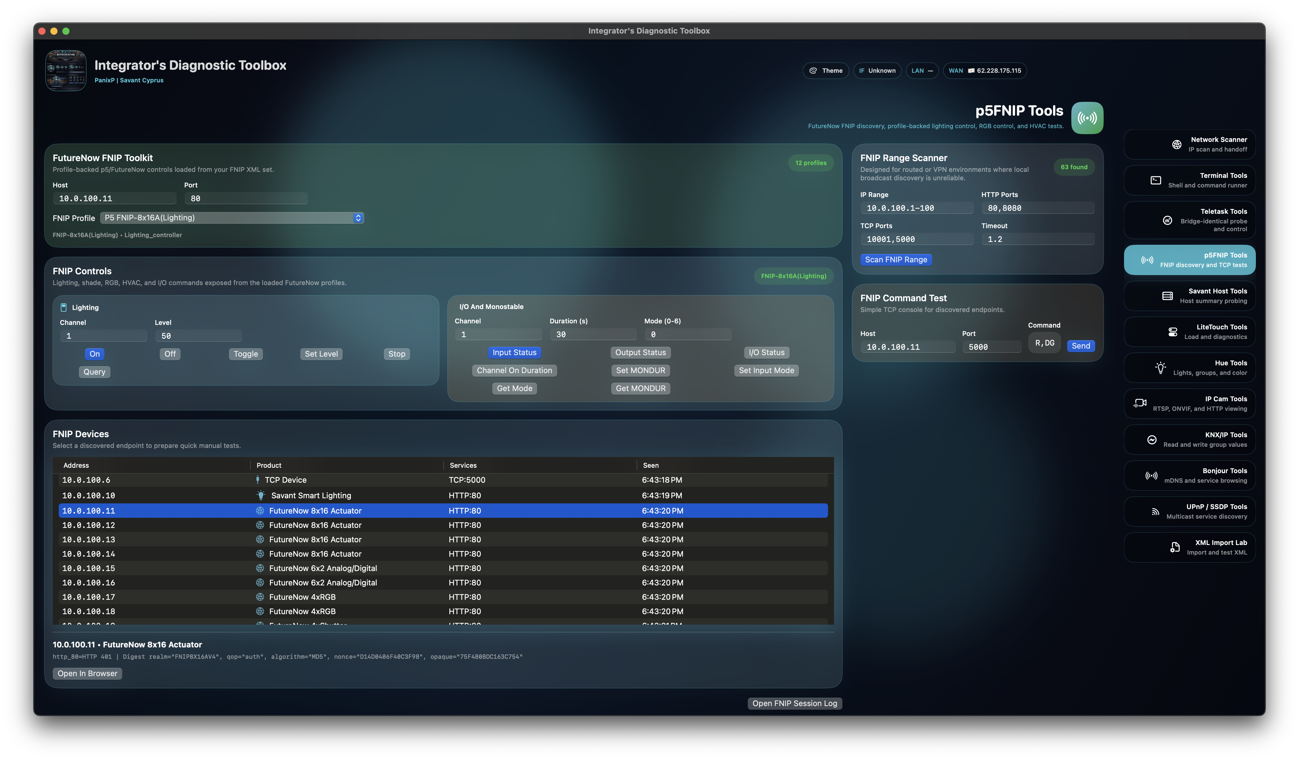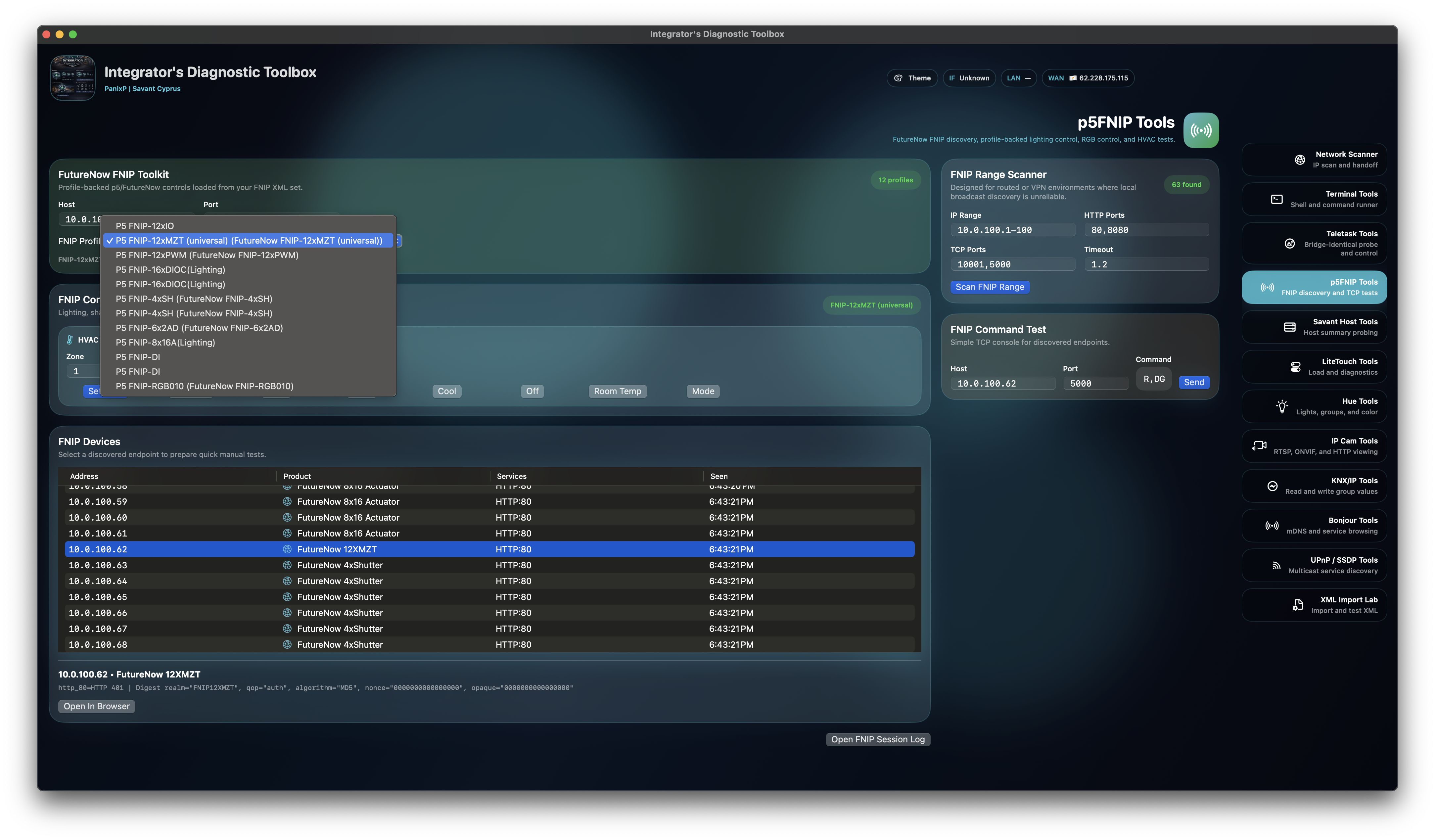 FNIP diagnostics with range expansion, HTTP/TCP probing, product hints, service matching, direct command send, and built-in support for 100% of p5.hu FNIP products for discovery and test control.