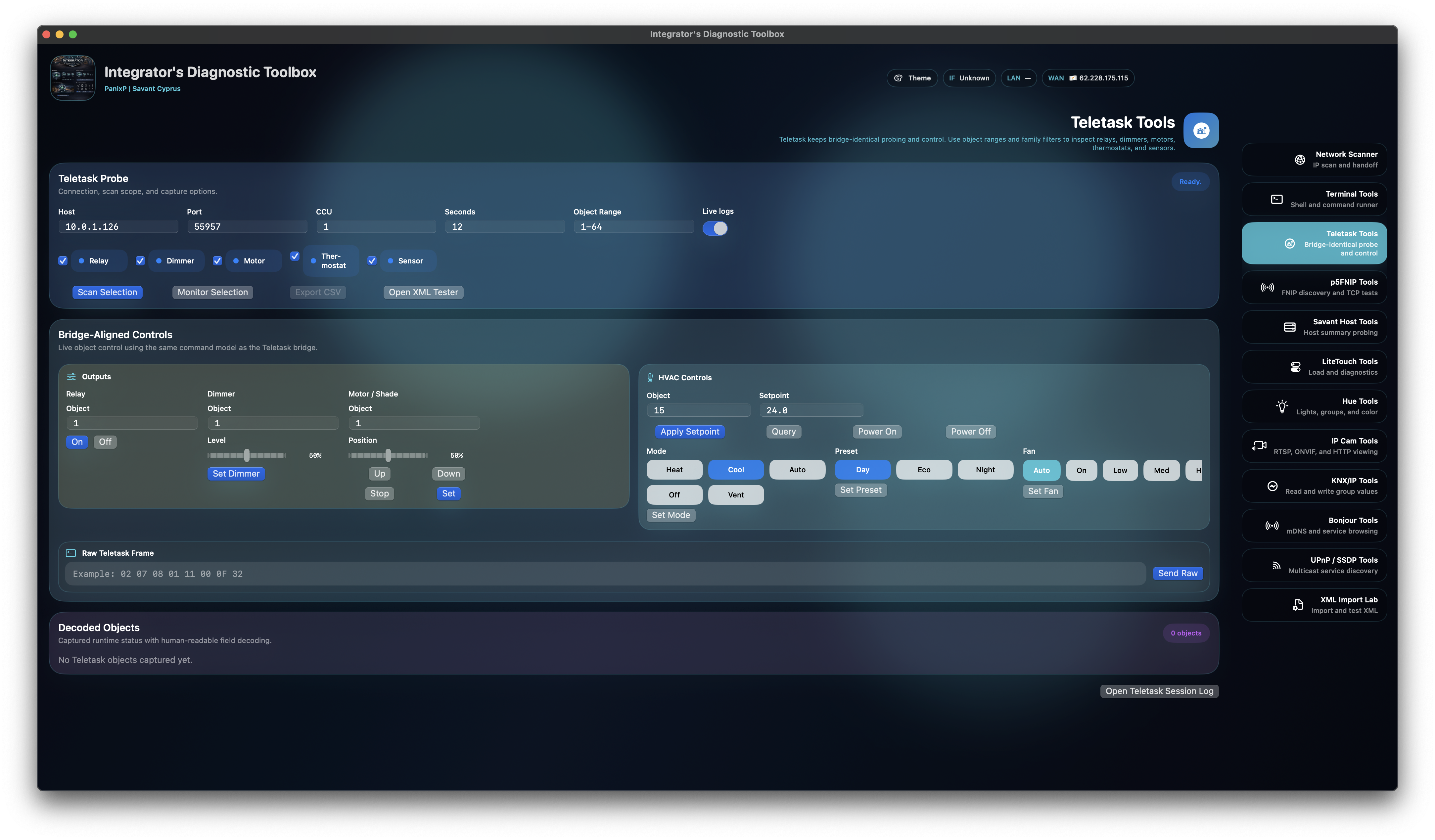 Probe, monitor, export, and directly exercise relay, dimmer, motor, and HVAC object paths from one bridge-aligned workspace. It is presented here as the most powerful and unique Teletask DoIP tool on any platform, with support for the latest v5 Teletask firmware.