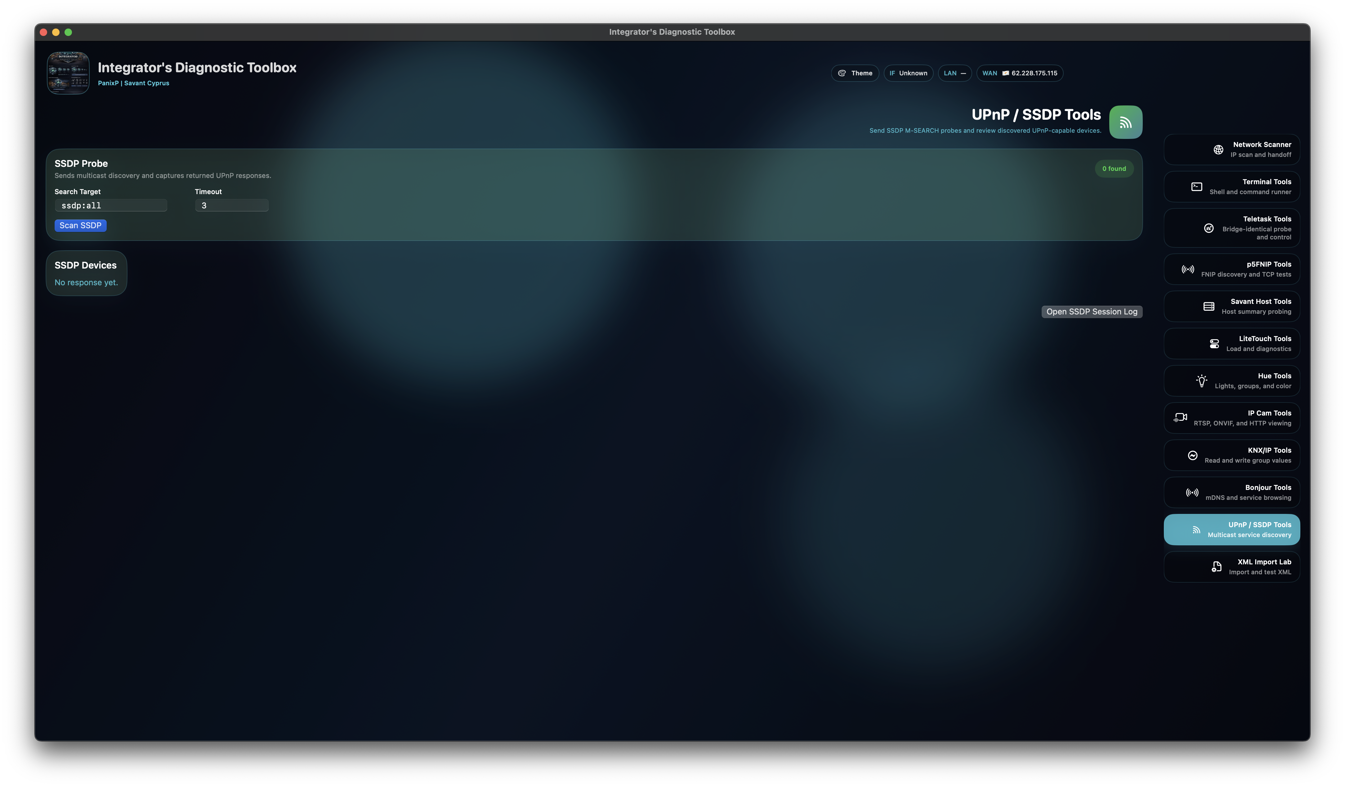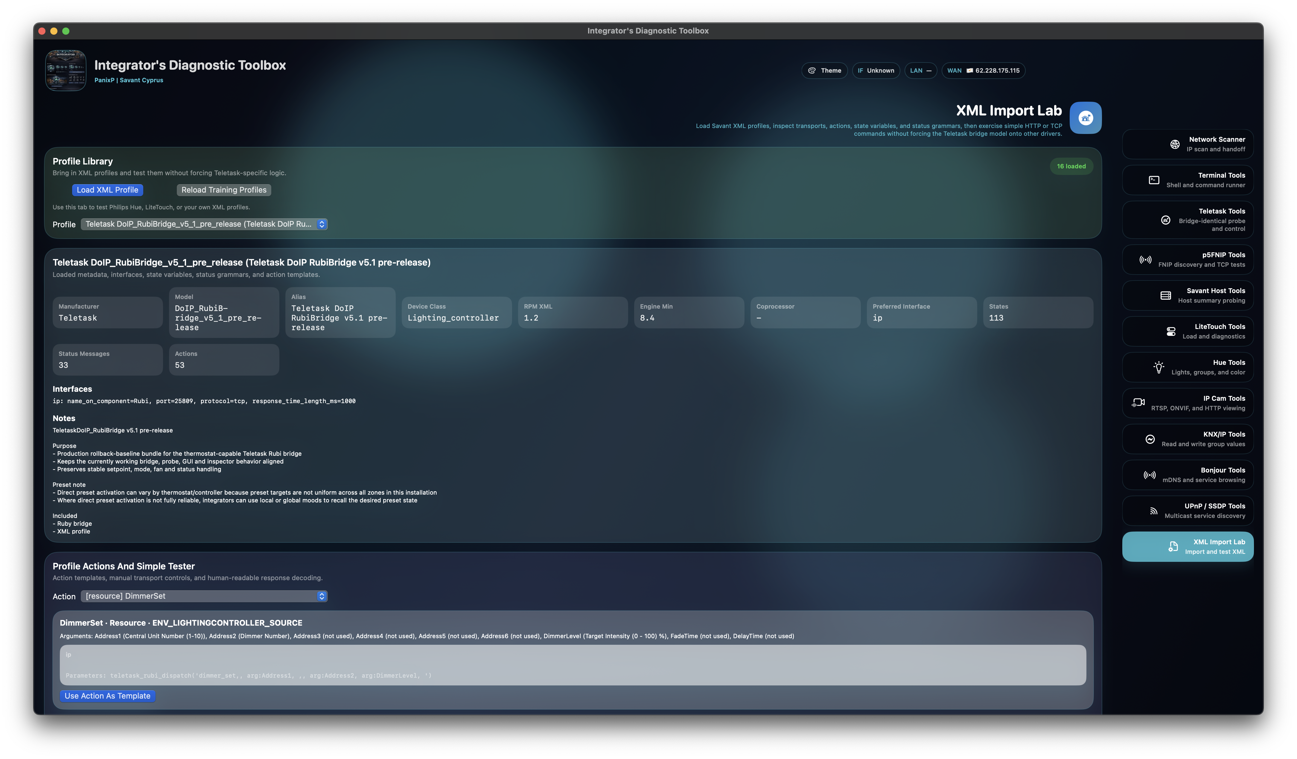 It combines network discovery, protocol diagnostics, profile-driven command surfaces, Savant XML schema-based profile testing, and structured export tools